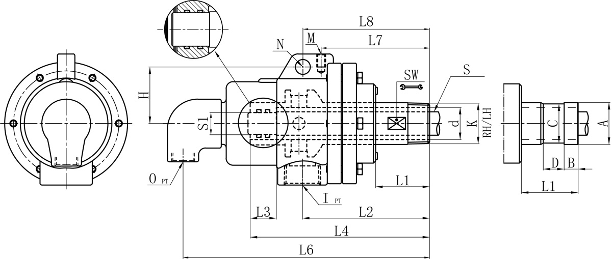 | Model | K | I | O | S1 | d | L1 | L2 | L3 | L4 | L6 | L7 | L8 | M | N | H | SW | 法蘭式外管尺寸對照表 | |||