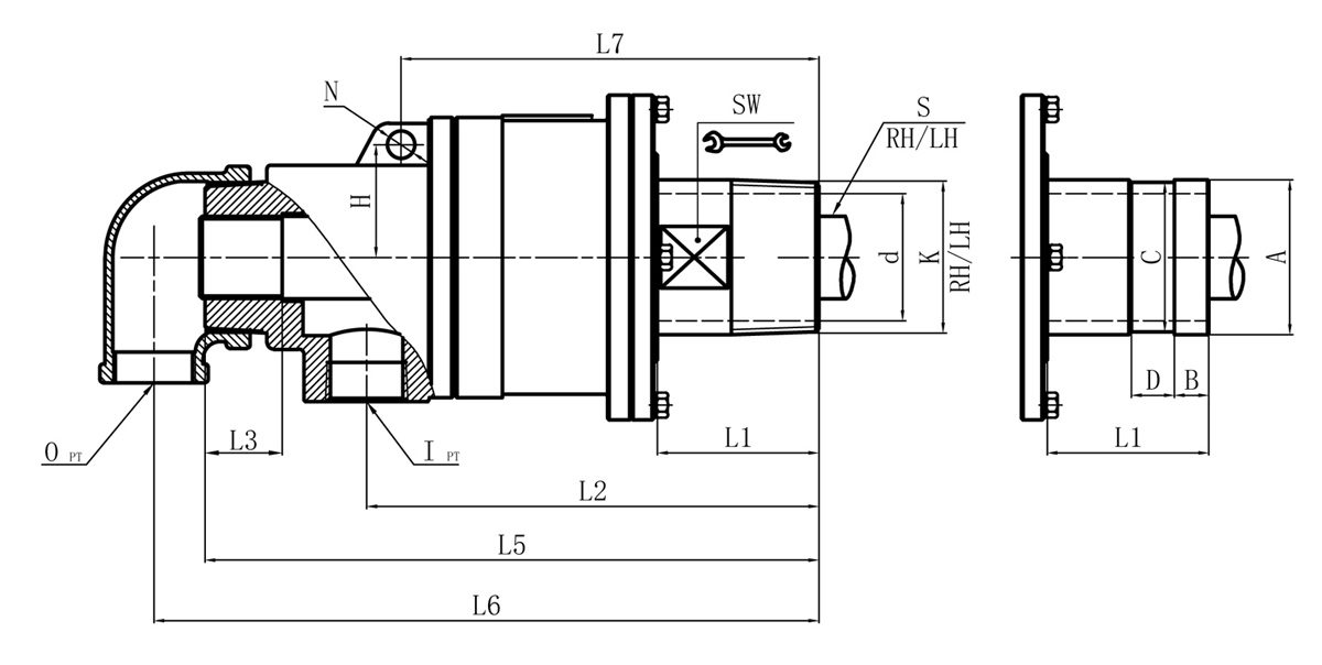 Model K M I O S S1 D1 L1 L2 L3 L5 L6 L7 L8 N SW H 法蘭式外管尺寸對照表